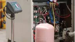 通過(guò)電子秤準(zhǔn)確補(bǔ)充液態(tài)制冷劑量;充注時(shí)請(qǐng)注意制冷劑瓶的方向。